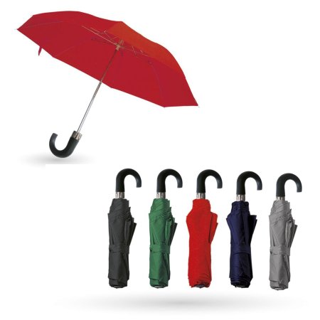 Ombrello scatto automatico. Poliestere 190T. Manico curvo in gomma colorata, con bottone in contrasto. Stecche in fiberglass nero. Asta nera. Puntale plastica colorata. Colori: arancio, rosso, blu, tiffany blu, verde lime, viola. Dimensioni Ø cm. 105 h 85